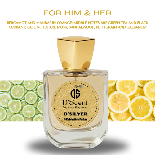 D’Silver, inspired by the Silver Mountain Water by Creed is a Aromatic fragrance for women and men. Top notes are Bergamot and Mandarin Orange; middle notes are Green Tea and Black Currant; base notes are Musk, Sandalwood, Petitgrain and Galbanum..